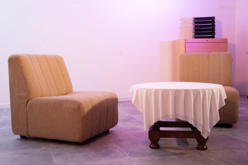 le plateau de tournage dispose d’un aménagement soigné avec une décoration adaptée aux productions audiovisuelles. L’espace est équipé pour garantir une bonne qualité d’image et un confort optimal lors des tournages. Il comprend deux petits fauteuils, parfaits pour les interviews ou échanges filmés, et un éclairage adapté aux prises de vue.